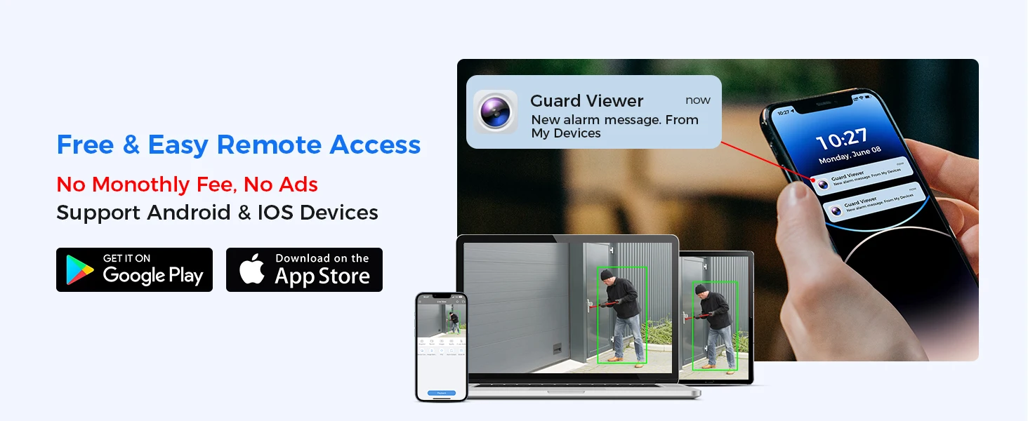 Free app for live view & Playback on Mobile Phone with Wi-Fi anywhere anytime.This camera is alert and ready to react to any potential danger via smart light alarm system – triggered by human motion events or controlled manually to keep troubles away.